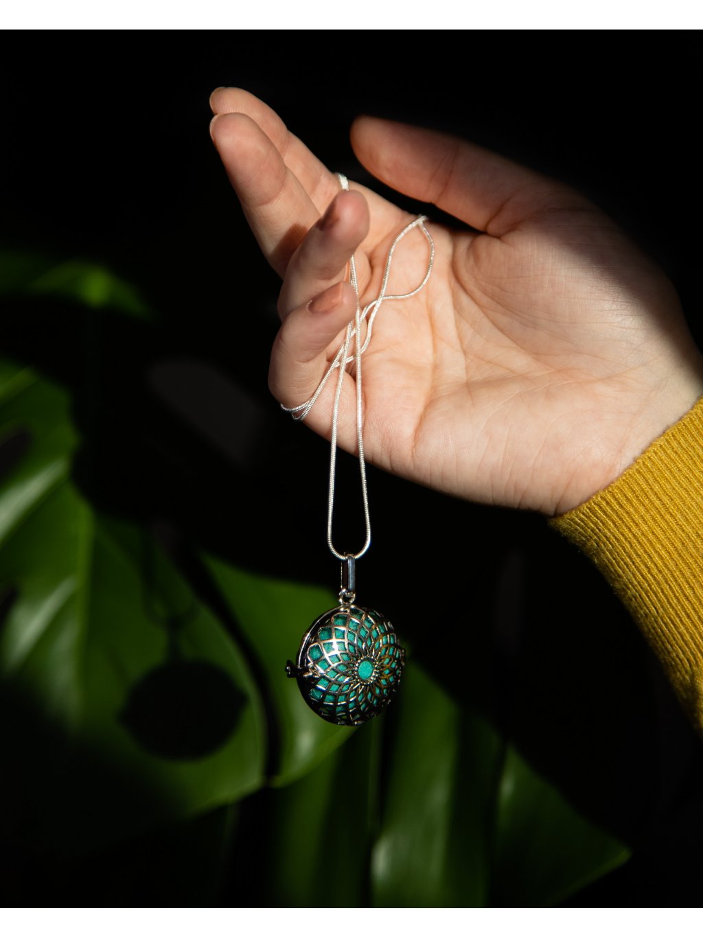 POMANDER Gema je nepřehlédnutelný. Zavěšen na stříbrném řetízku působí velmi atraktivně. Obyčejně se prodává prázdný, ve speciální vánoční kolekci jej však získáte se dvěma vůněmi.