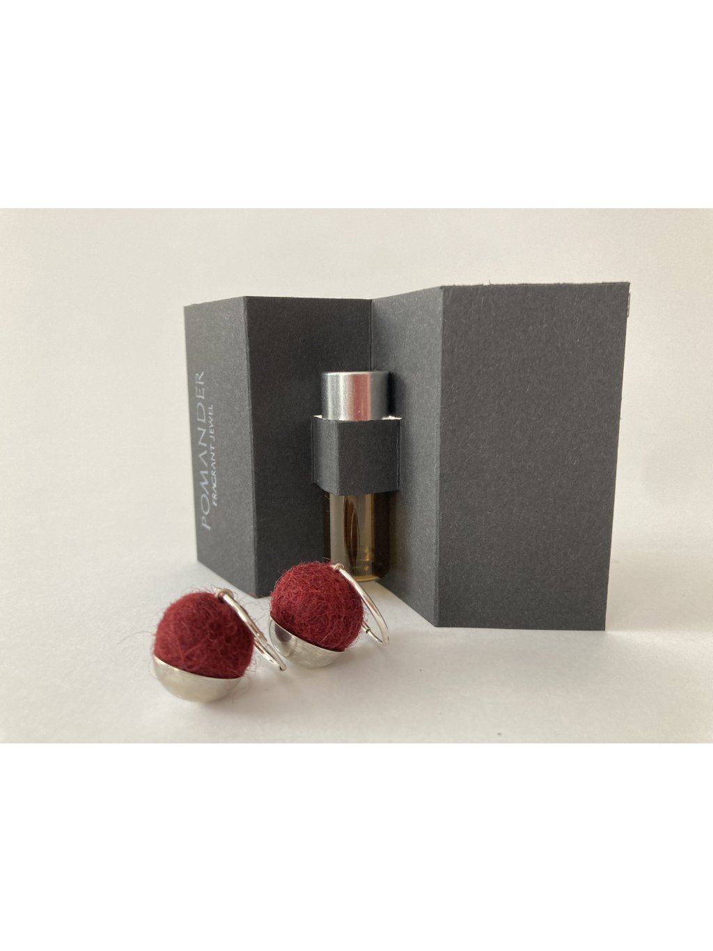Stříbrný POMANDER ve formě náušnic. Autorsky vyrobený šperk Adélou Melenovou nabízíme na zakázku a individuální objednání. Jemný mechanismus umožňuje upevnit ve stříbrném šperku vlněnou plstěnou kuličku či korál z lávového kamene, které dobře nesou vůně.