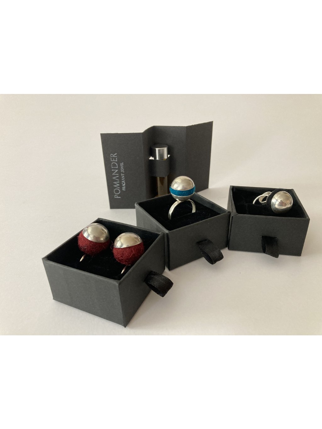 Stříbrný POMANDER prsten. Autorsky vyrobený šperk Adélou Melenovou nabízíme na zakázku a individuální objednání. Jemný mechanismus umožňuje upevnit ve stříbrném šperku vlněnou plstěnou kuličku či korál z lávového kamene, které dobře nesou vůně.